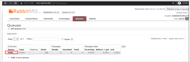 ‘queue’ 태그를 확인 해 보면 overview 에 hello라는 queue를 확인 할 수 있다.