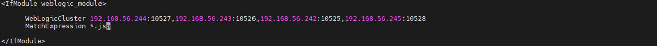 | <IfModule weblogic_module> WebLogicCluster 192.168.56.242:15021,192.168.56.243:1502 MatchExpression *.jsp . </IfModule> |