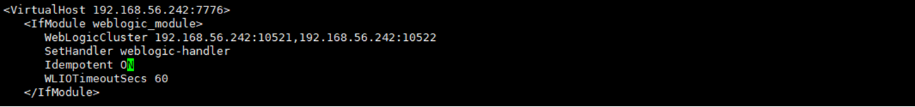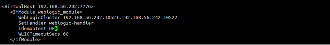 | <IfModule weblogic_module> . Idempotent OFF WLIOTimeoutSecs 600 . </IfModule> |