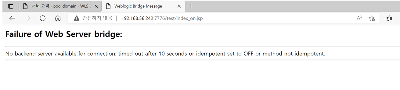 Idemponent OFF 이고 WLIOTimeoutSecs 의 값을 넘었을 때 다른 클러스터를 정상적으로 호출하지 못하고 Web Server Bridge 에러가 발생 하였다.