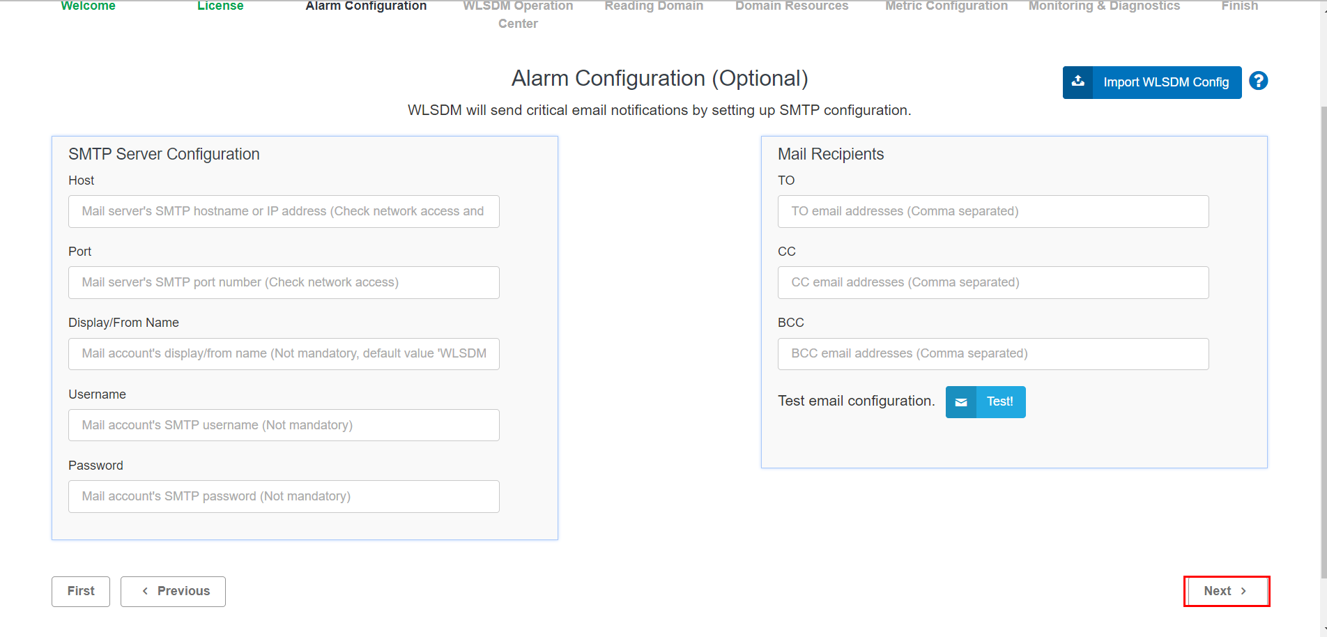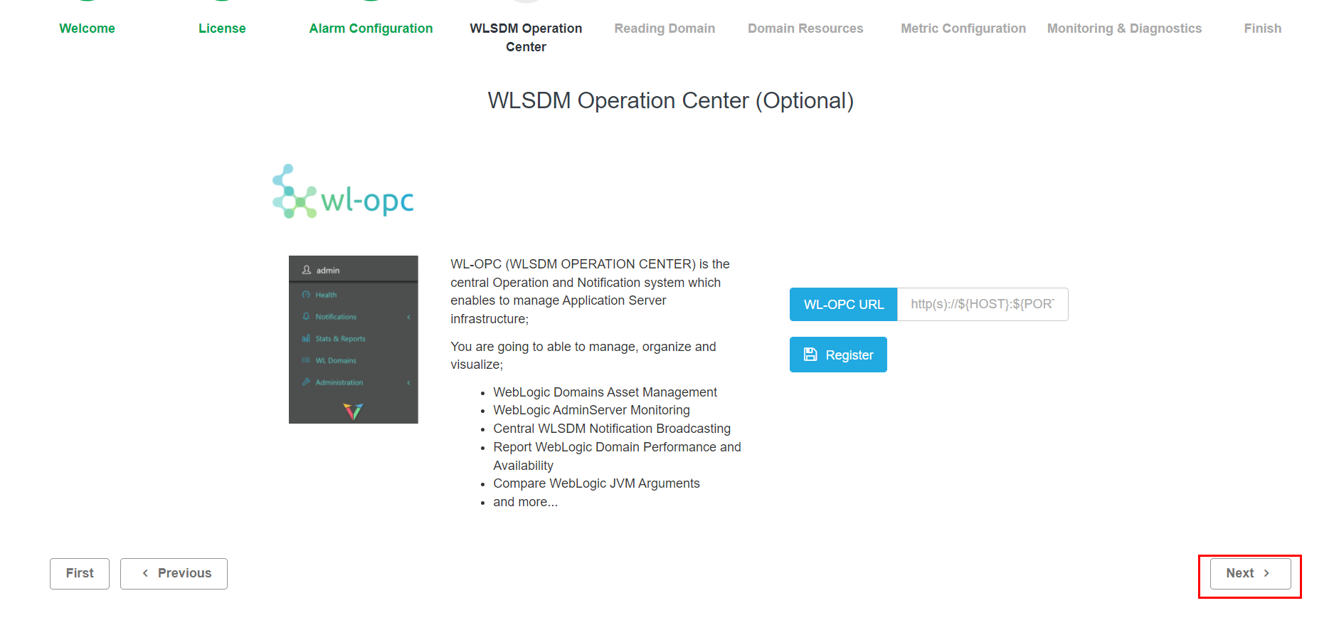 WL-OPC(WLSDM OPERATION CENTER)는 Application Server 인프라를 관리할 수 있는 중앙 운영 및 알림 시스템입니다. WL-OPC URL 에 http://IP:PORT/opc 형식으로 등록하면 되지만 현재 구성에서는 설정을 하지 않음으로 다음을 누릅니다.