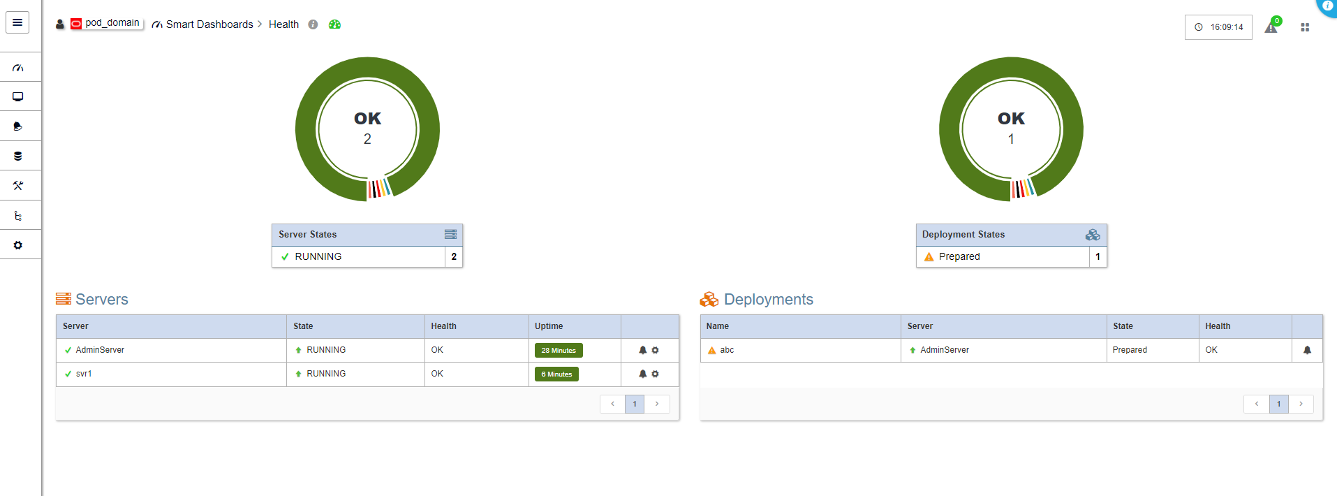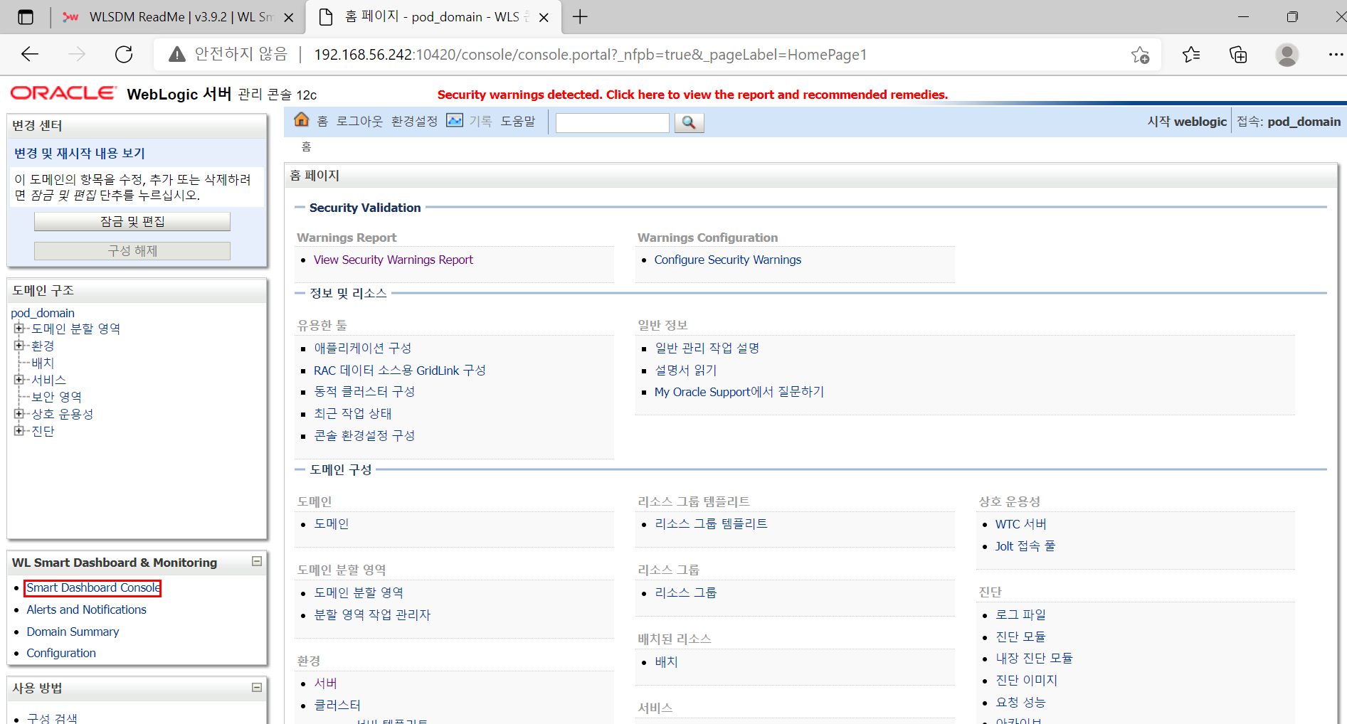 weblogic console 접속 후 home 화면을 보면 좌측 아래에 새로운 UI가 보인다. "Smart Dashboard Console" 을 클릭한다.
