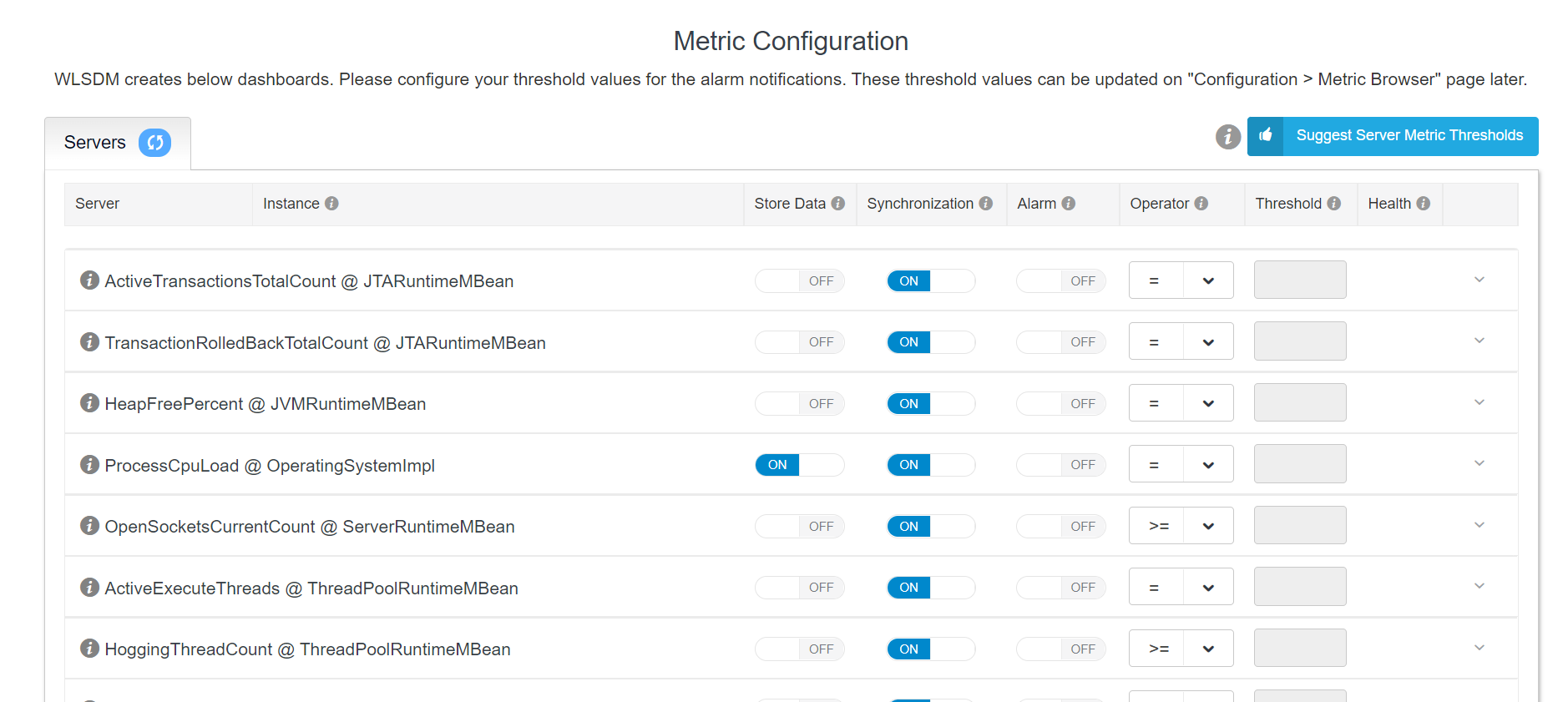 WLSDM은 아래 대시보드를 생성합니다. 알람 알림에 대한 임계값을 구성하십시오. 이러한 임계값은 나중에 "구성 > 메트릭 브라우저" 페이지에서 업데이트할 수 있습니다. 구성 변경 없이 다음을 누릅니다. 현재 구성에서는 Alarm을 사용하지 않으니 Alarm 부분은 전부 off로 변경 후 다음을 누릅니다.