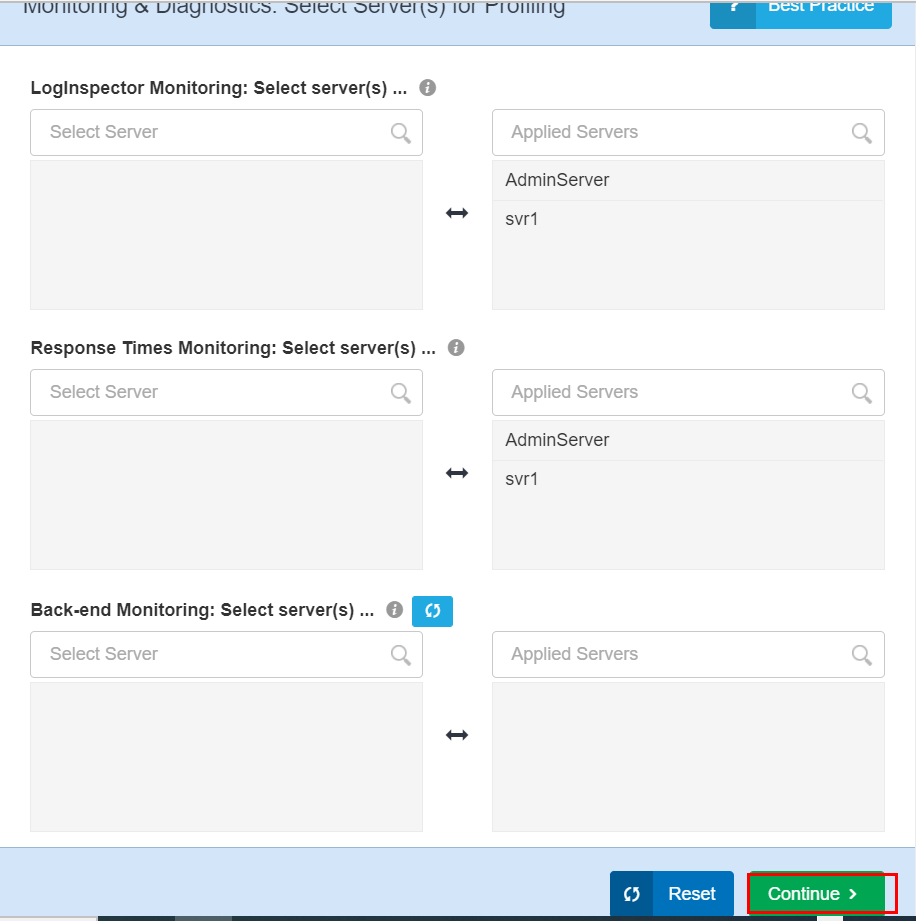 아래 화면이 나오는데 Select 부분에 있는 서버들을 클릭한다. 그러면 아래와 같이 해당 서버들이 Applied Server 로 변경되는데 Continue를 누릅니다.